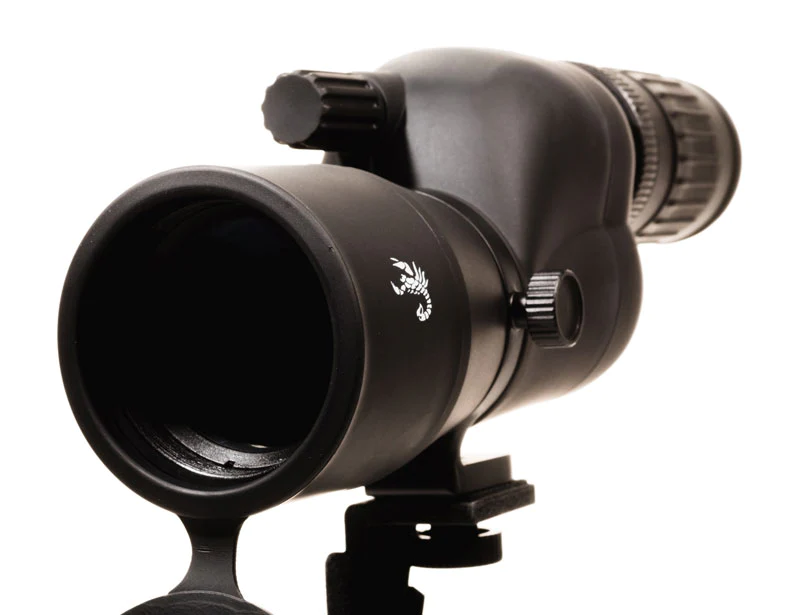 The Scorpion Optics SC028 12-36x50 compact spotting scope is BIG on features even though it's small in stature. This double ED glass scope is high resolution and has crystal clear contrast. The scope is waterproof / fog proof and has our Watershed fully multi-coated lenses. The compact inline design makes it perfect for using on a window mount or backpacking up a mountainside where weight and size make all the difference. The package includes a built-in sunshade, lens covers, tripod, and carrying case. The SC028 Spotting Scope is covered by our lifetime "Sting-Free" Warranty.