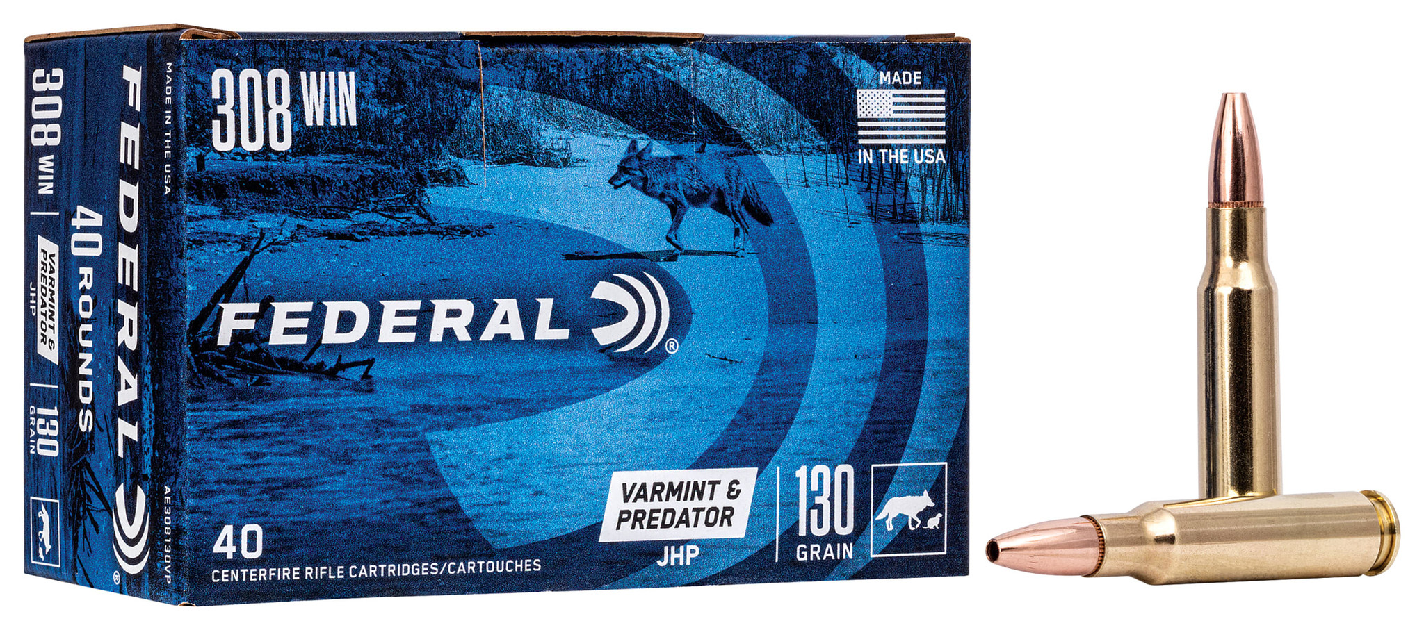 Federal® Varmint & Predator .308 Winchester 130 Grain JHP Rifle Ammo is designed to perform well on anything from prairie dogs to coyotes. You'll receive top-quality bullets manufactured to deliver excellent accuracy with explosive expansion. Federal uses highly-reliable brass, primers, and powder ensuring a rifle-round design that delivers.