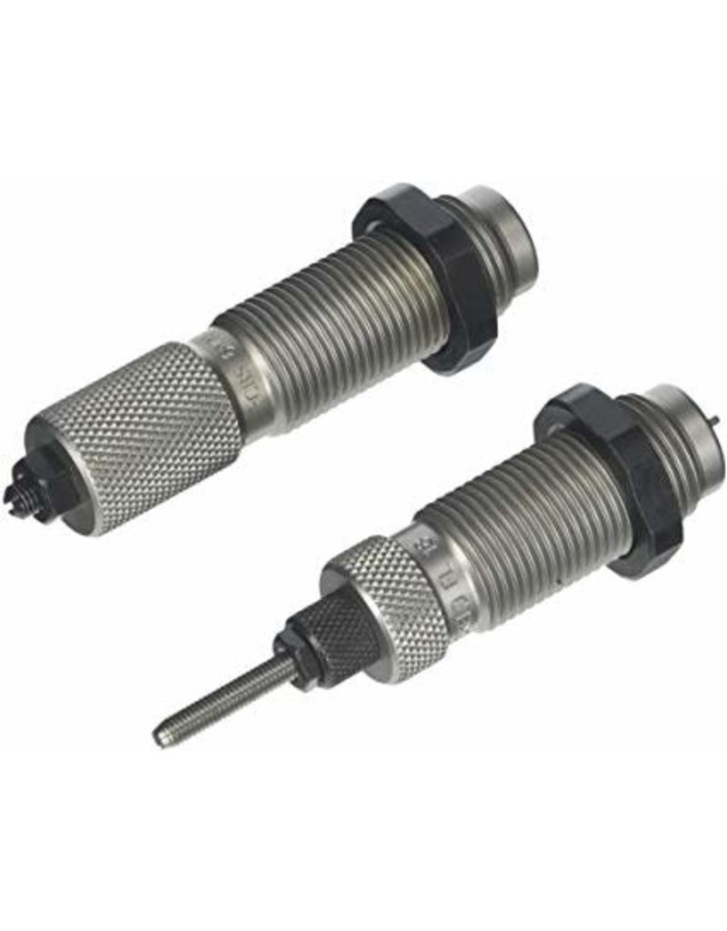 This two-die set is intended for reloading bottleneck cases, and consists of a Full-Length Sizer Die with an Expander-Decapping Unit, and a Seater Die with Bullet Seater Plug. The Full-Length Sizer Die brings the case to SAAMI minimum cartridge dimensions. It sizes the outside of the case, de-primes and expands the neck to accept the bullet. The die has vents to prevent case damage caused by trapped air and for excessive lubricant. Headspace is held to minimum tolerances to avoid changing the case body length during full length sizing. The included Seater Die has a built-in roll crimper to secure the bullet at the same time as it's seated.
