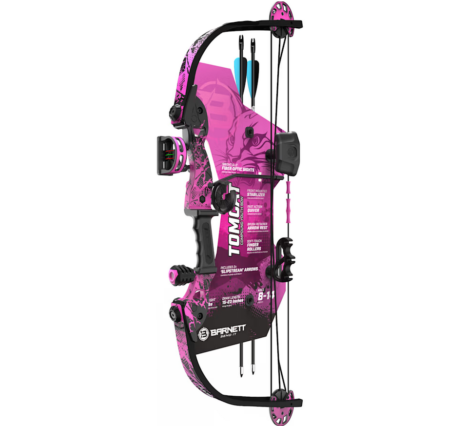 The Tomcatâ„¢ G3 youth compound bow is designed for young archers ages 8 and up who are taking steps to progress their skills. With a parallel limb design that greatly reduces hand shock, the Tomcat G3 meets the mark in accuracy and precision, while still maintaining a manageable 17- to 22-pound draw weight. This right-handed youth bow comes complete with a 3-pin fiber optic "Brightglo" sight for use in low light. Additional upgrades include soft-touch finger rollers, brush retainer arrow rest, front mount stabilizer, string loop, and attached quiver.