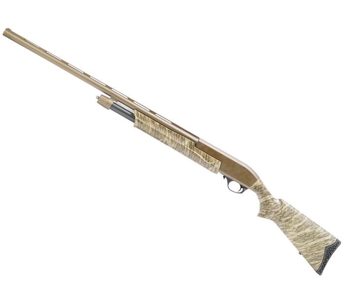 The Canuck Hunter shotgun is a pump-action 12ga. shotgun with a 3" chamber and a 28" vent rib chrome-lined barrel with a red fibre optic front bead. The receiver and barrel are midnight bronze and the stock features a Mossy Oak Bottomlands camouflage pattern.