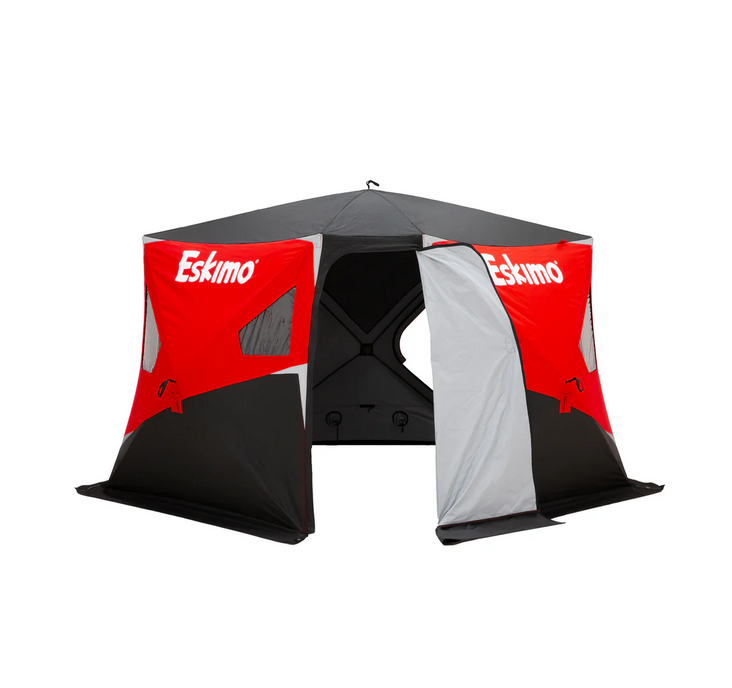 Flared-bottom shelter shape provides a spacious interior for a group of anglers to enjoy a day on the ice in comfort.