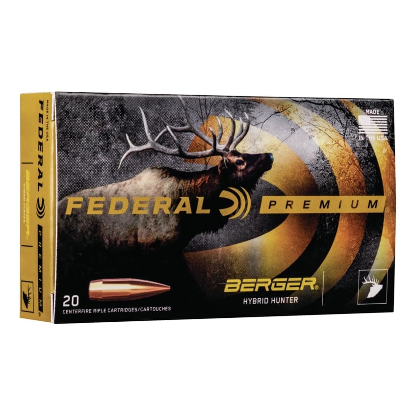 A blend the profile of a low-drag match bullet with a traditional hunting projectile design and you’re ready to take on almost anything that walks on four legs. Federal Premium® Berger® Hybrid Hunter bullet weights have been fine-tuned to provide exceptional accuracy through factory rifles. Ballistic coefficients exceed those of comparable designs thanks to a hybrid nose design that combines tangent and secant ogive features. The bullets are loaded with our finest nickel-plated brass, Gold Medal® primers and specially formulated propellant for the best consistency and reliability.