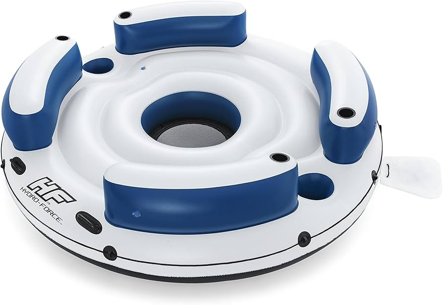 The Hydro-Force™ Lazy Dayz™ Inflatable Party Island brings the fun to the water for you and 3 friends or family members. The Lazy Dayz Island is made with Inflata-Shield™ material to prevent damage. This thicker material resists puncture, limits stretching and enhances grip. It also features 4 cup holders and 2 built-in storage compartments, so each person has a convenient place for their favorite drinks and snacks. With 4 extra-wide backrests and plenty of room to sprawl out, this island is as comfortable as it gets. The mesh opening in the center is perfect for when you want to dip your toes in the water. Heavy-duty handles allow you to hang on and help you get in and out of the float with ease. A grab rope wraps around the entire float, providing extra safety and ease when docking, or lets you latch multiple islands together to keep your friends near as you drift down the river or on the lake. Your day on the water with your friends or family wouldn’t be complete without the Hydro-Force Lazy Dayz Inflatable Party Island to lay back and relax on!