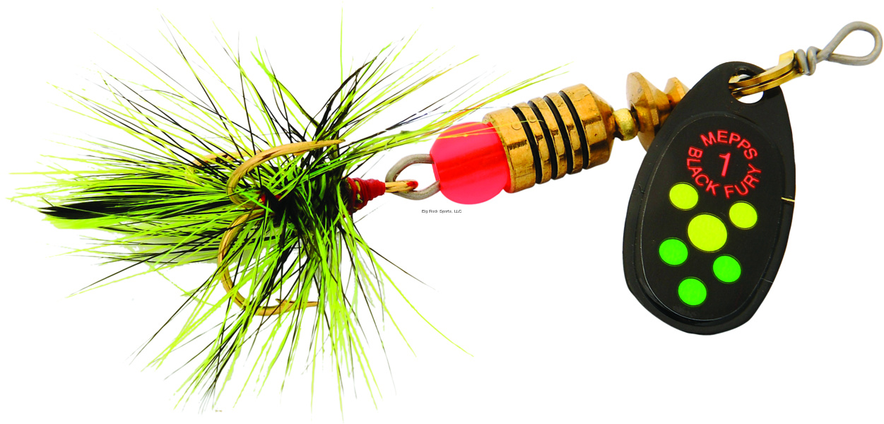 The Black Fury with a plain treble hook is one of the great all-time Mepps spinners. The special Black Fury blade spins closer to the body than the classic Aglia blade so it easily fishes shallow to mid-depths. Dressed and plain options. Very effective at catching a wide variety of freshwater game fish. Largemouth bass, smallmouth bass and walleye.