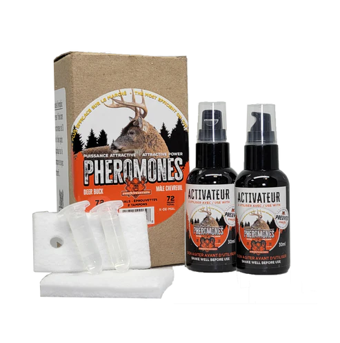 Arouse the curiosity of whitetail deer with our buck pheromones. Pheromones are chemical substances released by animals that trigger significant reactions in others. This tool signals the presence of a buck in the area, enticing deer to investigate your hunting site. Note that this product indicates the presence of a buck but does not suggest that he is in rut. Laboratory tests confirm that the odor remains potent for the first 36 hours and decreases thereafter. Each package of Mule Deer Pheromones includes 2 flasks of pheromones, 2 activators, and 2 pads. Everything you need to increase deer activity in your chosen area. Directions: Pour one flask of pheromones into an activator, mix well, then pour the mixture onto a pad and place it where you want to attract the game.