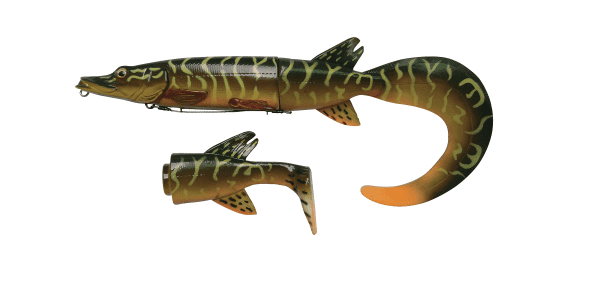 Blurring the lines between a hard and soft lure, Savage Gear®'s Hybrid Pike boasts a hard body with soft tails to trigger strikes from muskie and pike. This lure is based on a 3D scan of a baby pike and features lifelike colours to ensure realism. Wire is attached to a swivel in the head so fish can freely twist with the bait without throwing it. Includes two switchable tail sections – a paddle tail and a ribbon tail – to give you two lures in one. Per each.