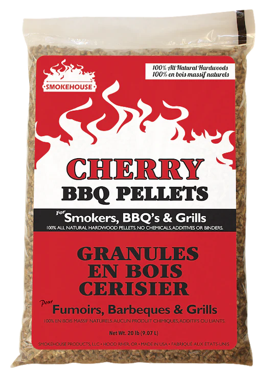 Our Cherry BBQ pellets are made with 100% cherry wood blended with Pacific Northwest alder base wood. Cherry wood, like apple, is fantastic with nearly any cut of meat and provides a nice sweet smoke flavor. Many competition BBQ cooks use cherry to achieve a dense smoke ring and sweet, mildly tart distinctive and delicious smoke flavor. Cherry wood is the perfect choice when cooking dark meats, so if you’re planning on smoking a roast, ribs or brisket, look no further.
