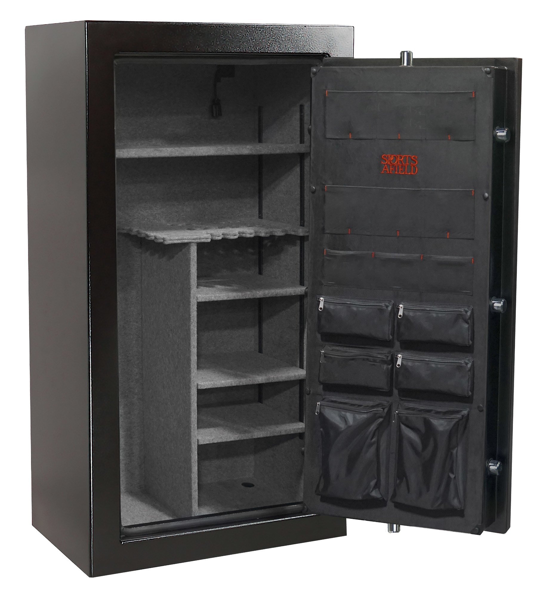 Fireproof and Waterproof 32-Gun Safe provides all the essentials for security, giving you total peace of mind. Our proprietary Triple Seal technology creates a seal against fire and smoke damage for 45 minutes in temperatures up to 1400°F and water protection for up to 7-days in 2 ft. of standing water. This long gun safe is constructed out of industrial grade steel with a fortified Uni-Weld body and eight 1.5 in. steel locking bolts. It features a fully programmable electronic lock, Anti-Theft Alarm, and comes with two Fail Safe override keys. The interior of the safe is fully carpeted and includes a barrel rack with 32 gun positions, a Zero-Sag steel reinforced top shelf that supports heavier items, and three height-adjustable side shelves. This gun safe is California DOJ approved and includes our best-in-class Lifetime Warranty that covers the entire safe against theft, fire, natural flood, locks, parts, and paint.