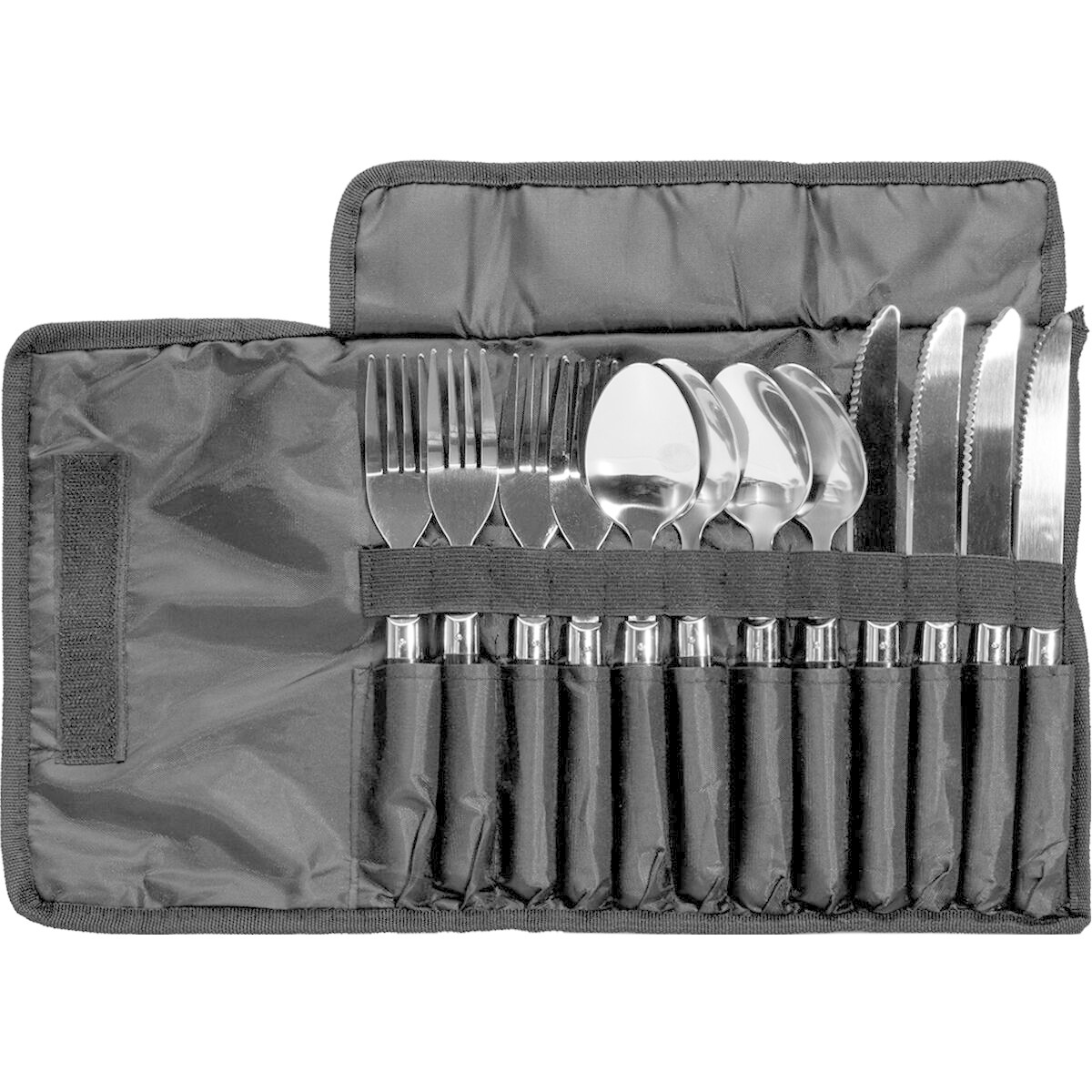 Coleman 12 piece stainless steel flatware set. Contains 4 forks, 4 spoons, 4 knives in convenient nylon roll up case Each utensil is rust resistant stainless steel with black plastic handle. Dishwasher safe. Great for RV, Camping, Camper, Picnic or Home!