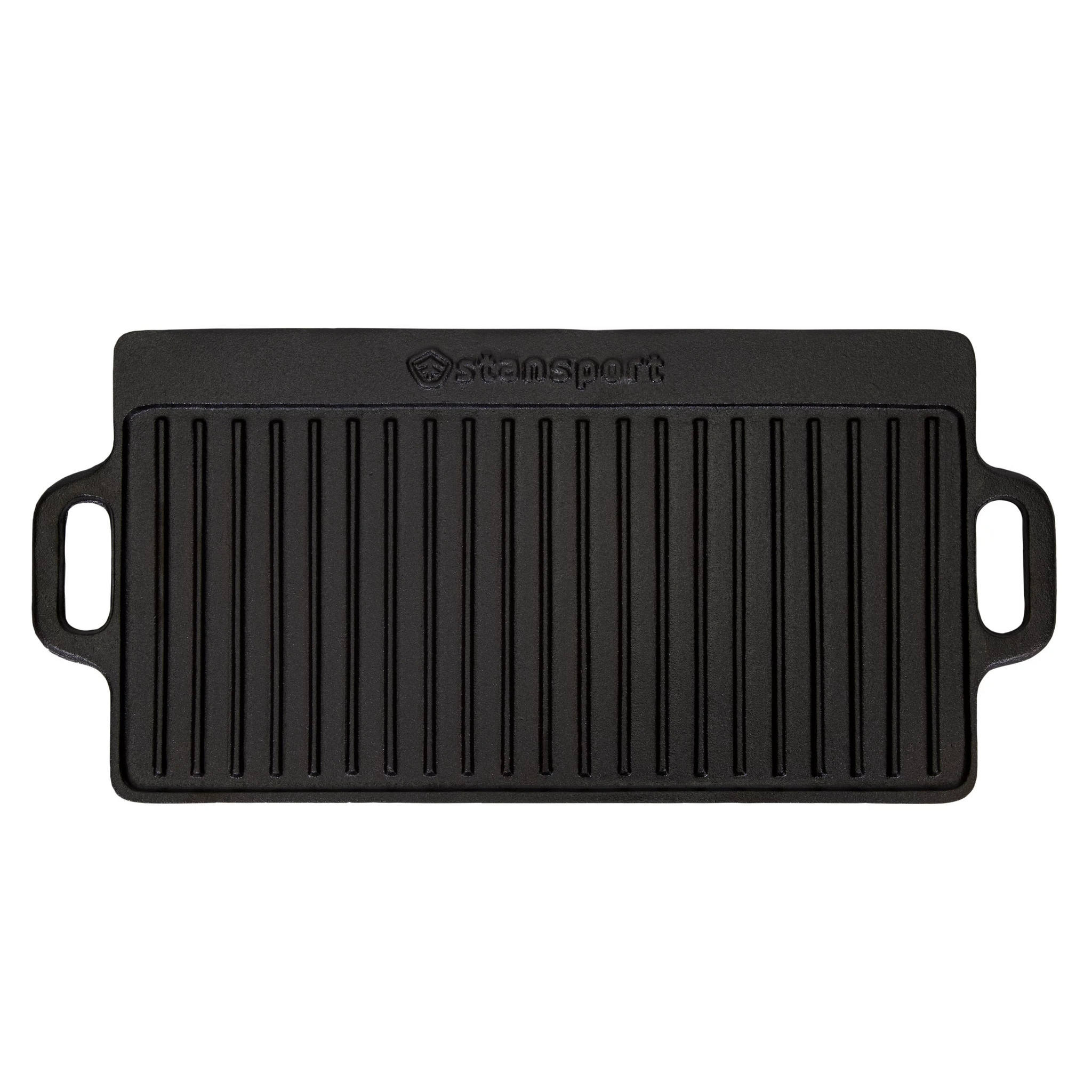 Breakfast is served! This Stansport® Pre-Seasoned Cast Iron Griddle cooks up potatoes, bacon and sausage with aplomb. The 9” x 20” cast-iron surface retains heat and builds a natural non-stick coating with use. Use the smooth surface for eggs, pancakes or other delicate breakfast foods, and the ridged side for steaks, chops and fish.